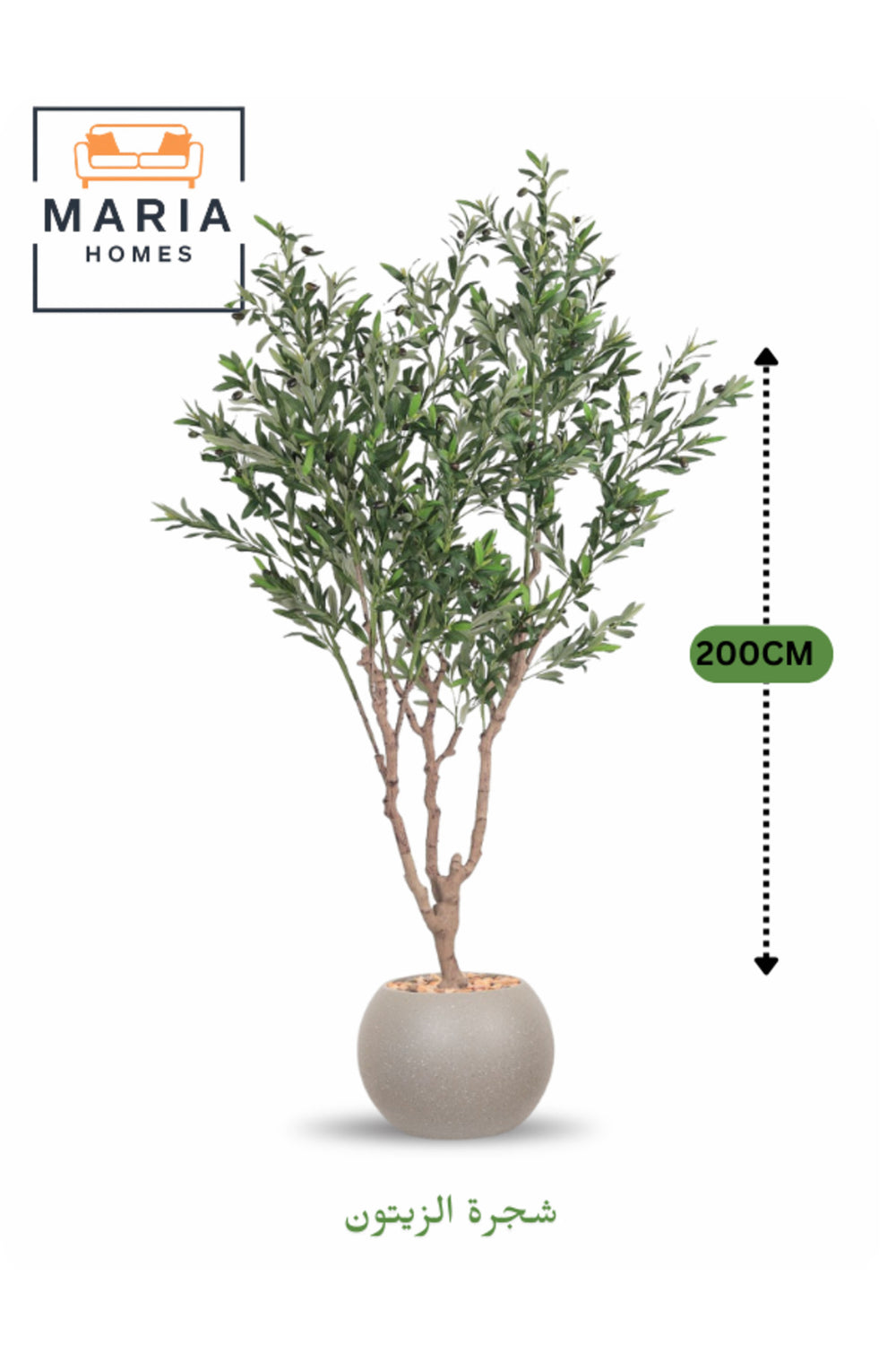 Add natural elegance to your interior with this 200 cm artificial olive tree in a light gray plastic pot.; Featuring realistic olive leaves and lifelike branches, it delivers a refreshing Mediterranean touch to your space.; Lightweight and durable, making it easy to move and perfect for living rooms, majlis gatherings, entrances, restaurants, and offices.; Requires no maintenance, no watering or trimming, and stays green all year round.