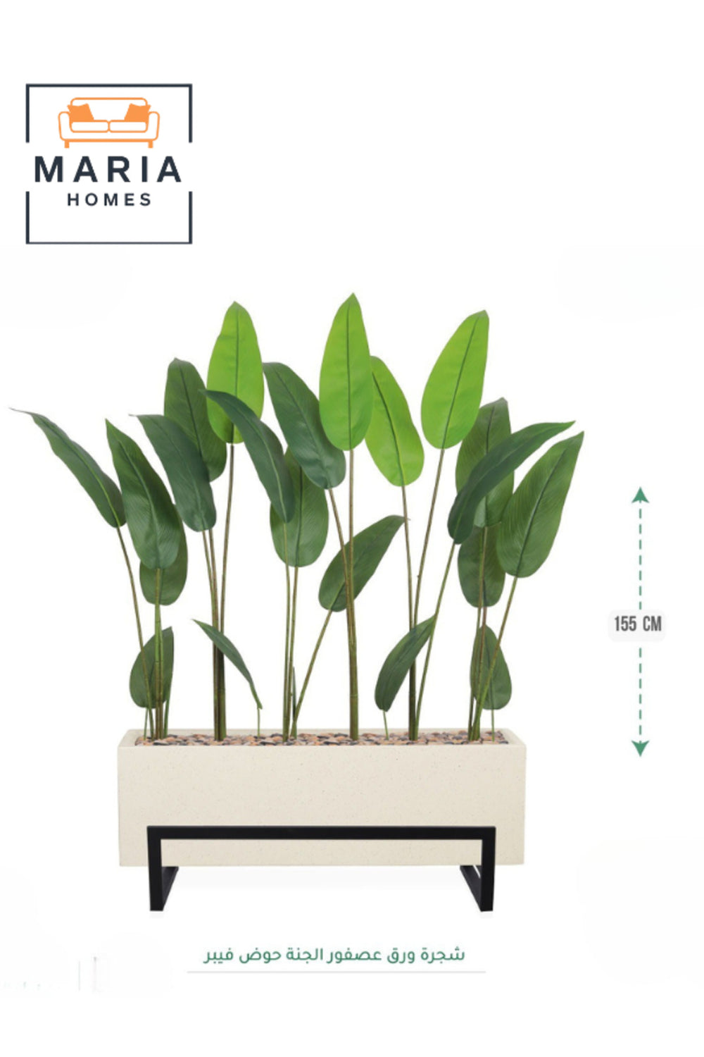 Create a modern and tropical atmosphere with this 155 cm tall artificial Bird of Paradise plant in a chic beige fiber pot.; Designed with realistic green leaves and decorative pebbles, it offers a refreshing look without watering or sunlight.; Perfect for living rooms, offices, majlis, or reception areas, this maintenance-free decorative plant enhances any interior with elegance and natural charm.