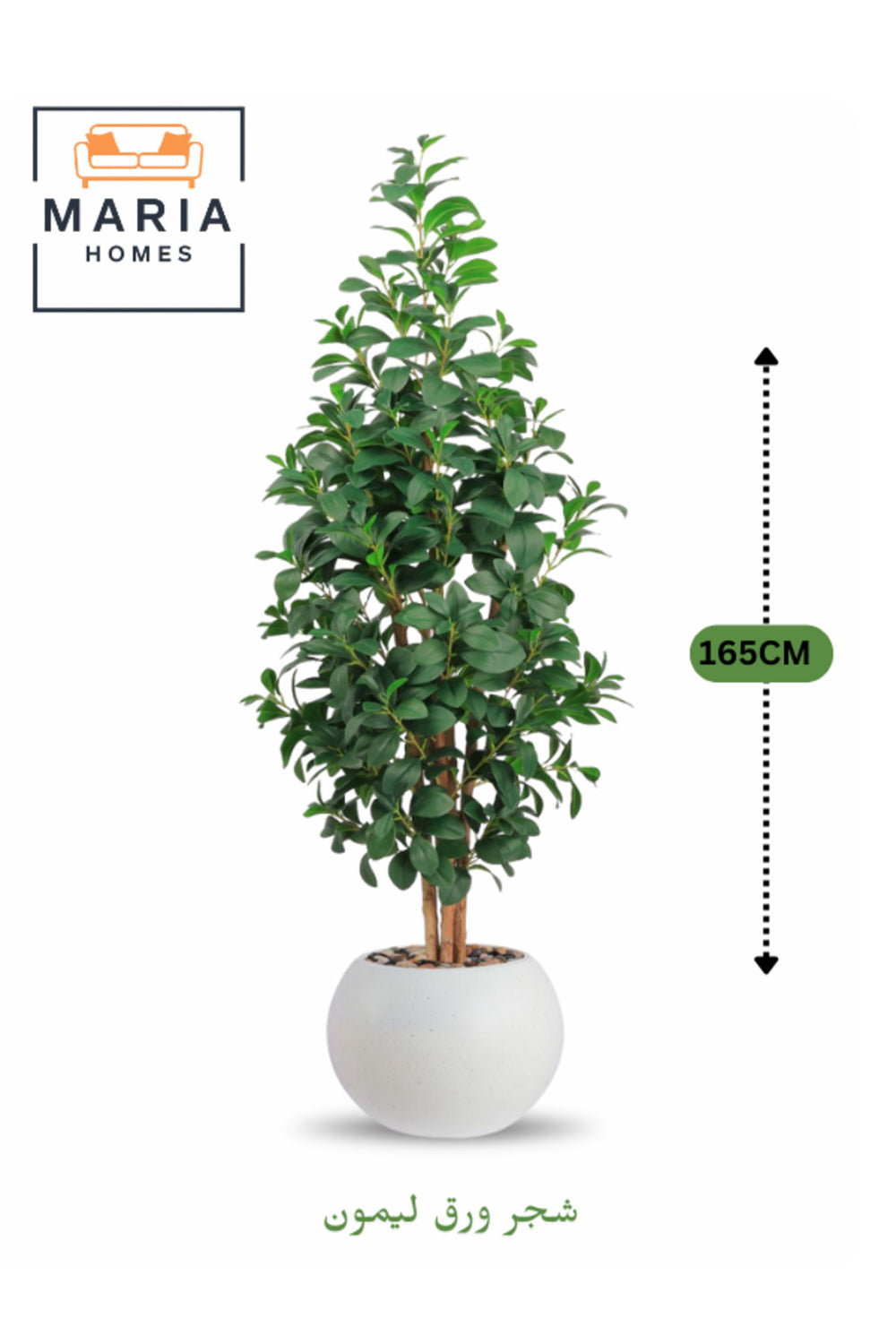 Bring elegance to your space with this 165 cm artificial lemon leaf tree, featuring lush green leaves and realistic stems for a natural look.; The round off-white plastic pot with decorative stones adds a soft, modern touch, making it perfect for living rooms, offices, receptions, and Arabic majlis settings.; A stylish and low-maintenance plant that keeps your interiors fresh and inviting all year round.