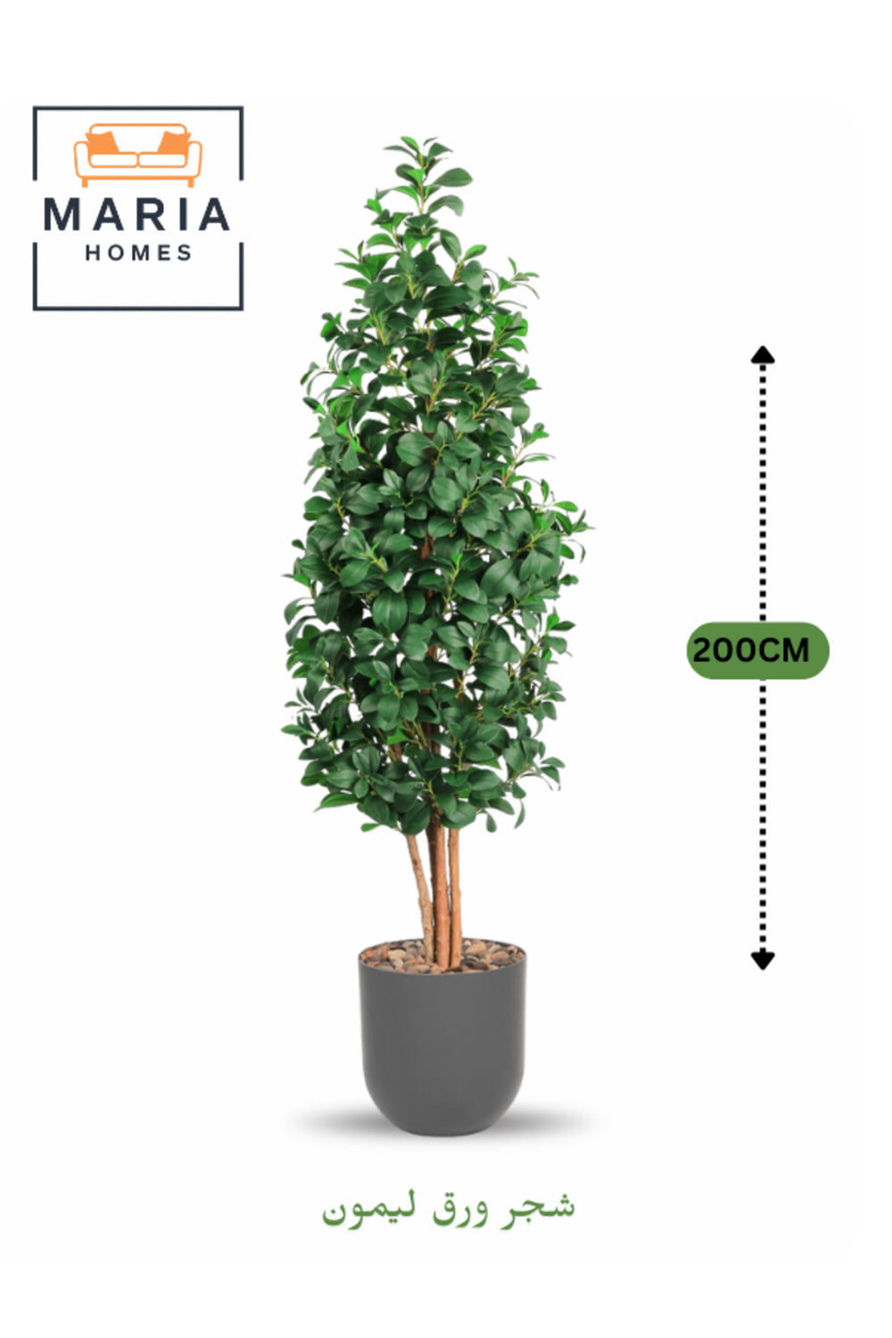 Refresh your interiors with this 200 cm artificial lemon leaf tree, crafted with lush green foliage and realistic wooden stems for a lifelike appearance.; The grey plastic pot with decorative stones enhances its modern elegance, making it suitable for living rooms, offices, receptions, and Arabic majlis dŽcor.; A low-maintenance plant that adds beauty and freshness to your space year-round.