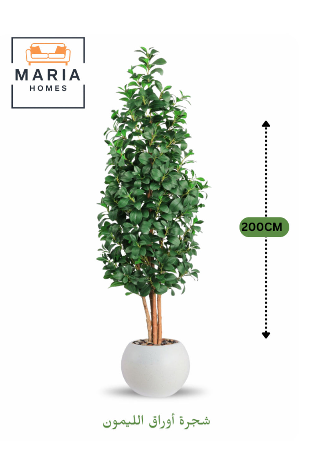 Enhance your interiors with this 200 cm artificial lemon leaf tree featuring lush green leaves and realistic wooden stems.; The modern grey plastic pot with decorative stones adds a natural yet elegant touch, making it perfect for living rooms, offices, receptions, and majlis dŽcor.; A zero-maintenance plant that brings freshness and style to any space.